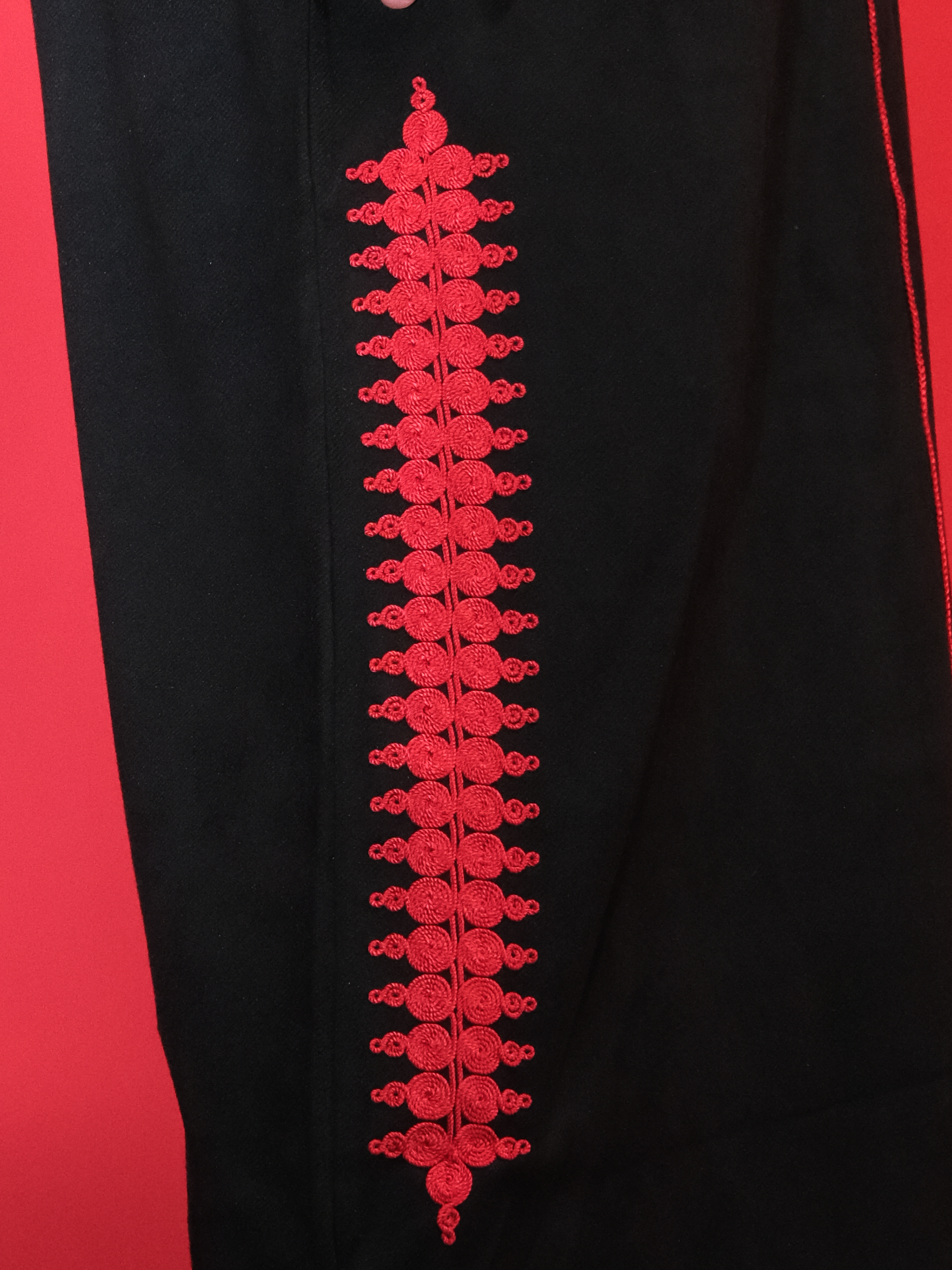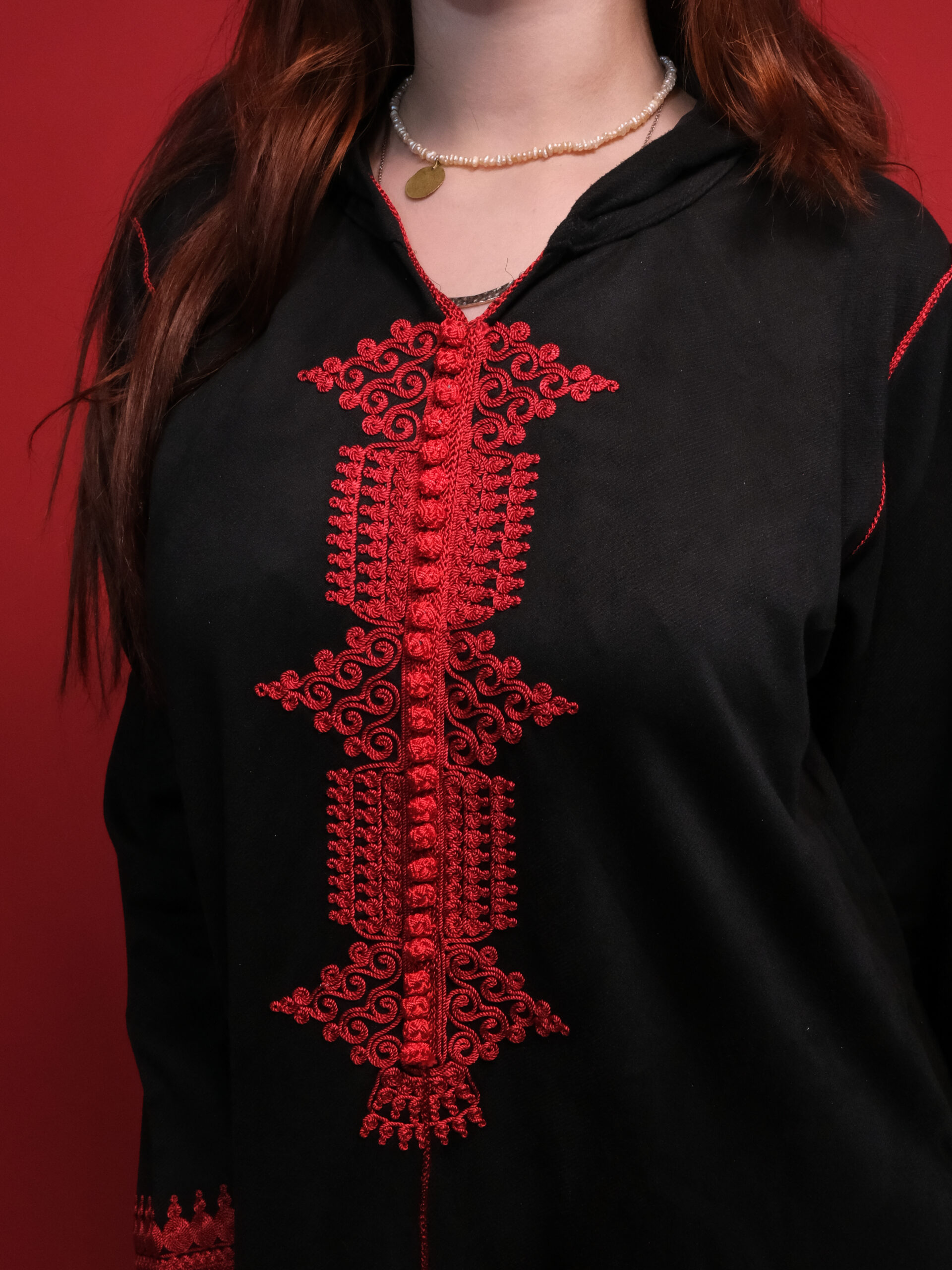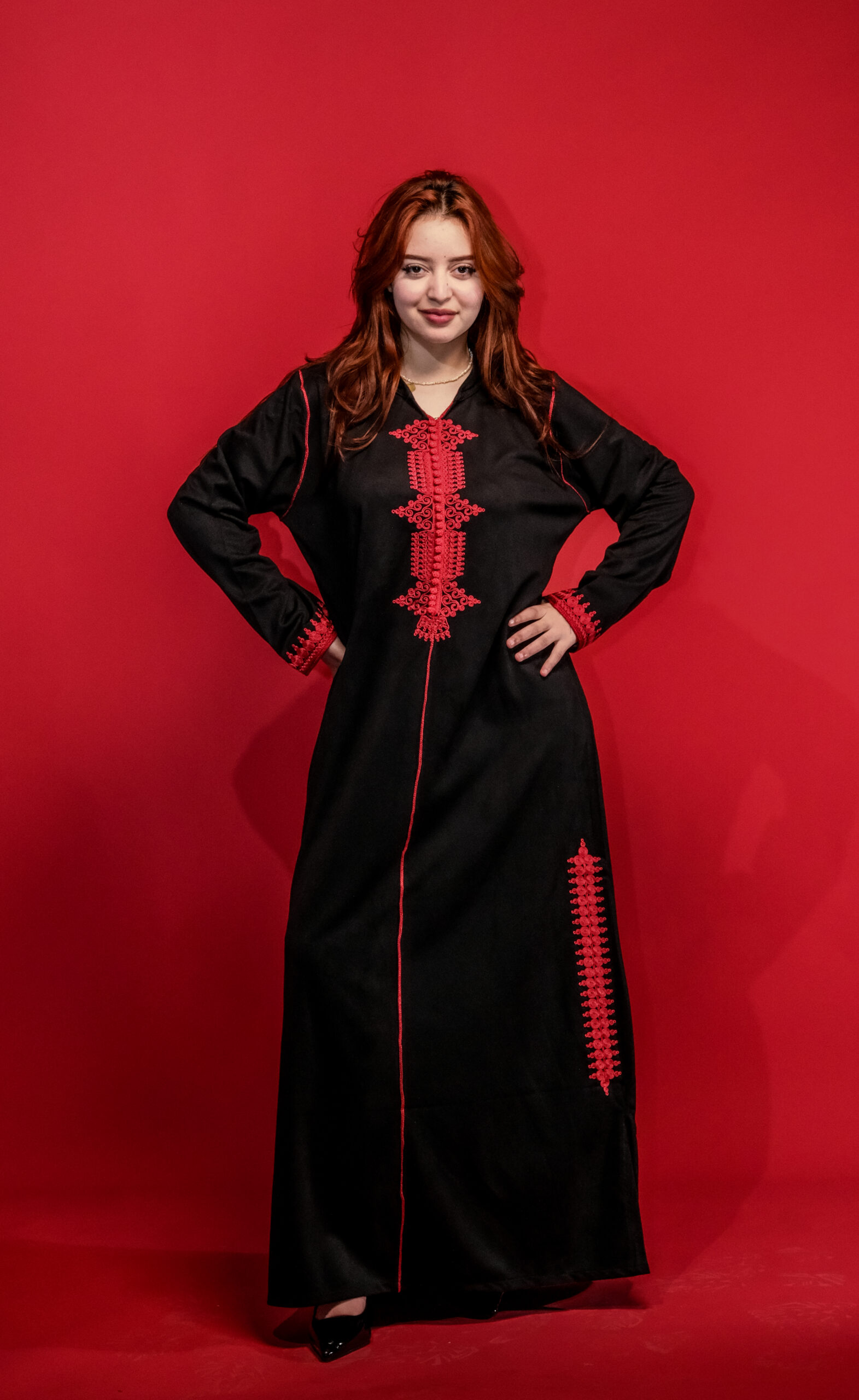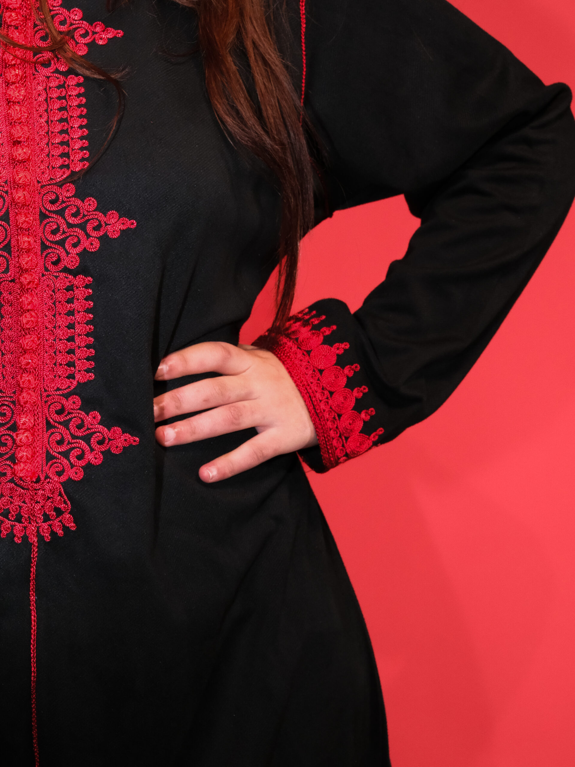 اللون: أسود ملكي فاحم مع تطريز باللون الأحمر القاني لتباين ساحر.