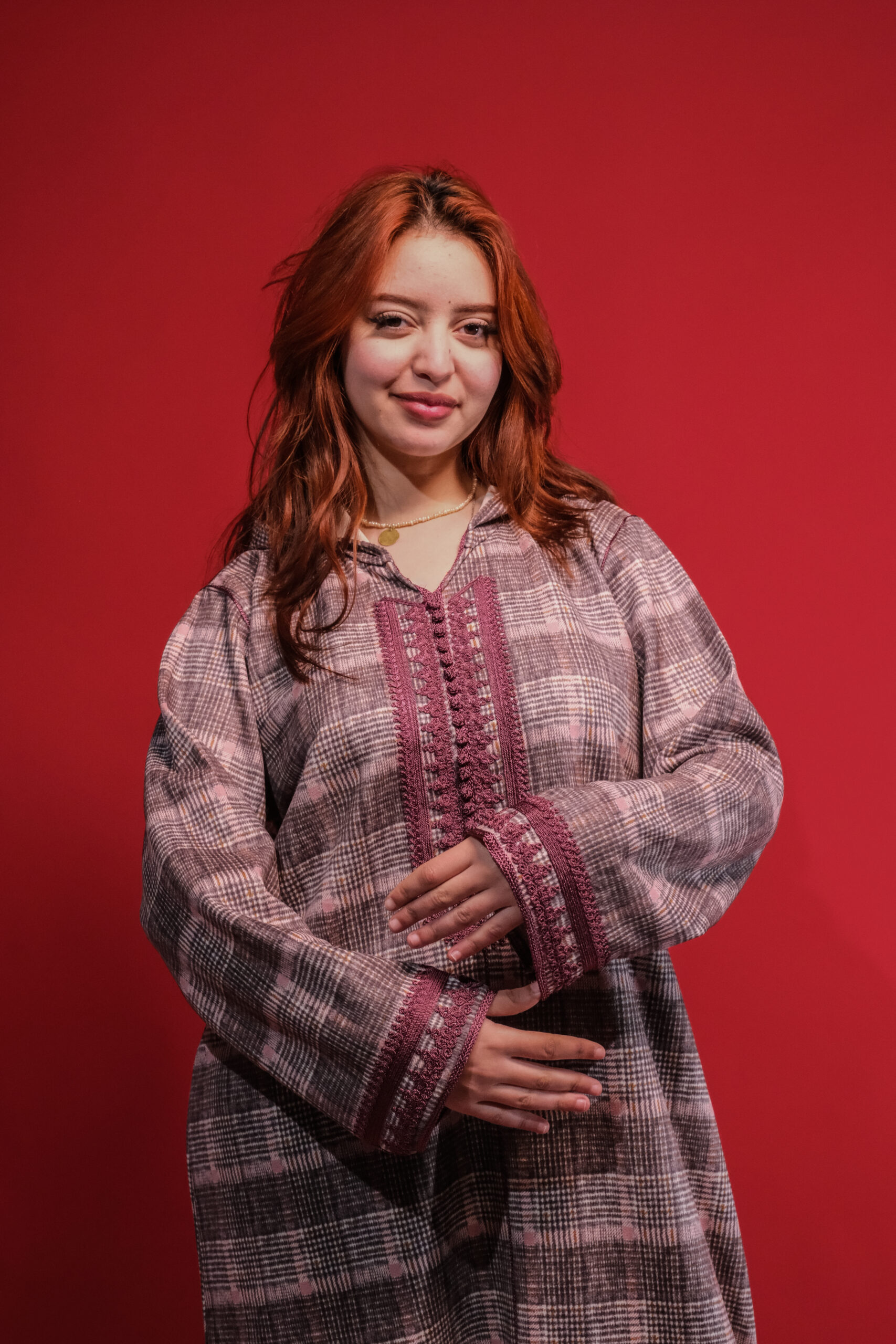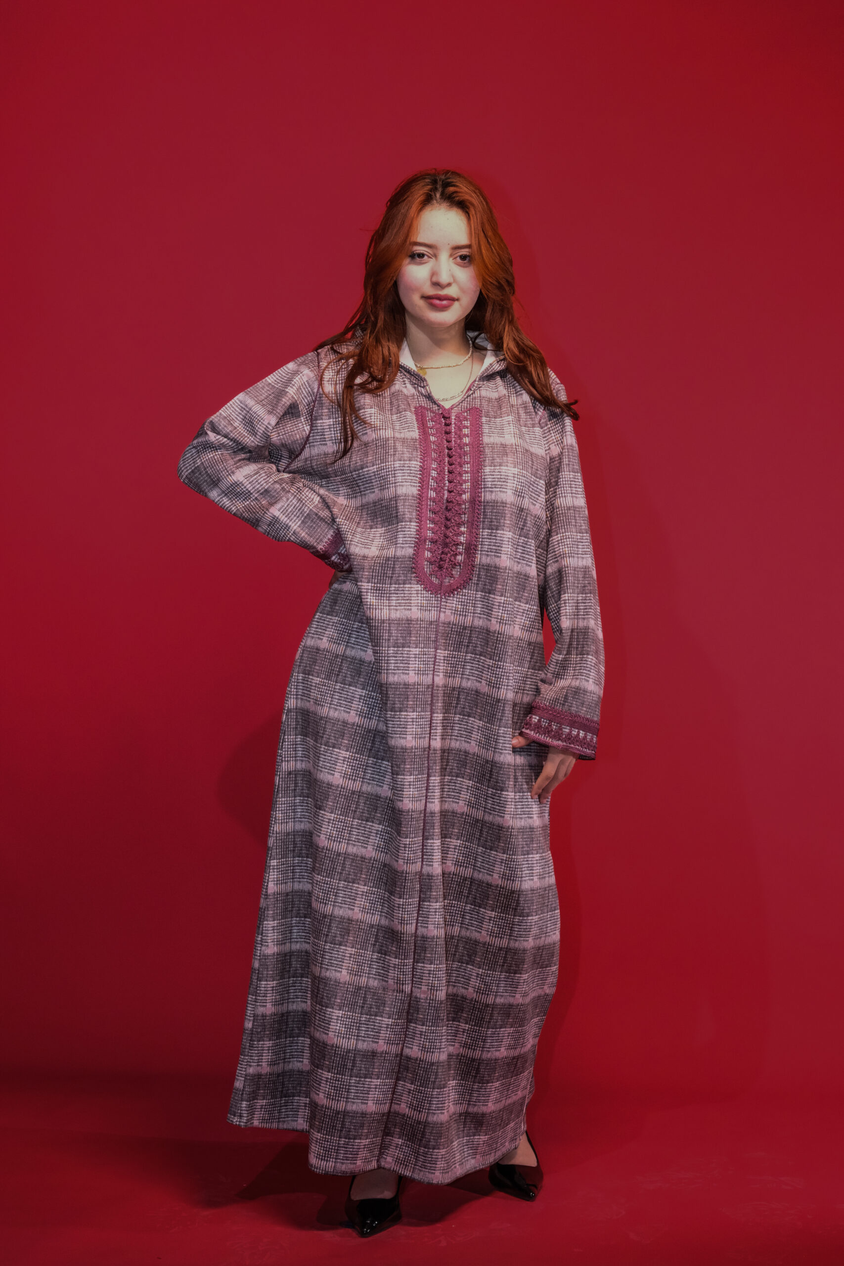 القماش: توب تويد شتوي ناعم ومنقوش بنقشة “الكارو” الأنيقة بألوان متناغمة تجمع بين الرمادي، الأبيض، ولمسات من الوردي الغامق.