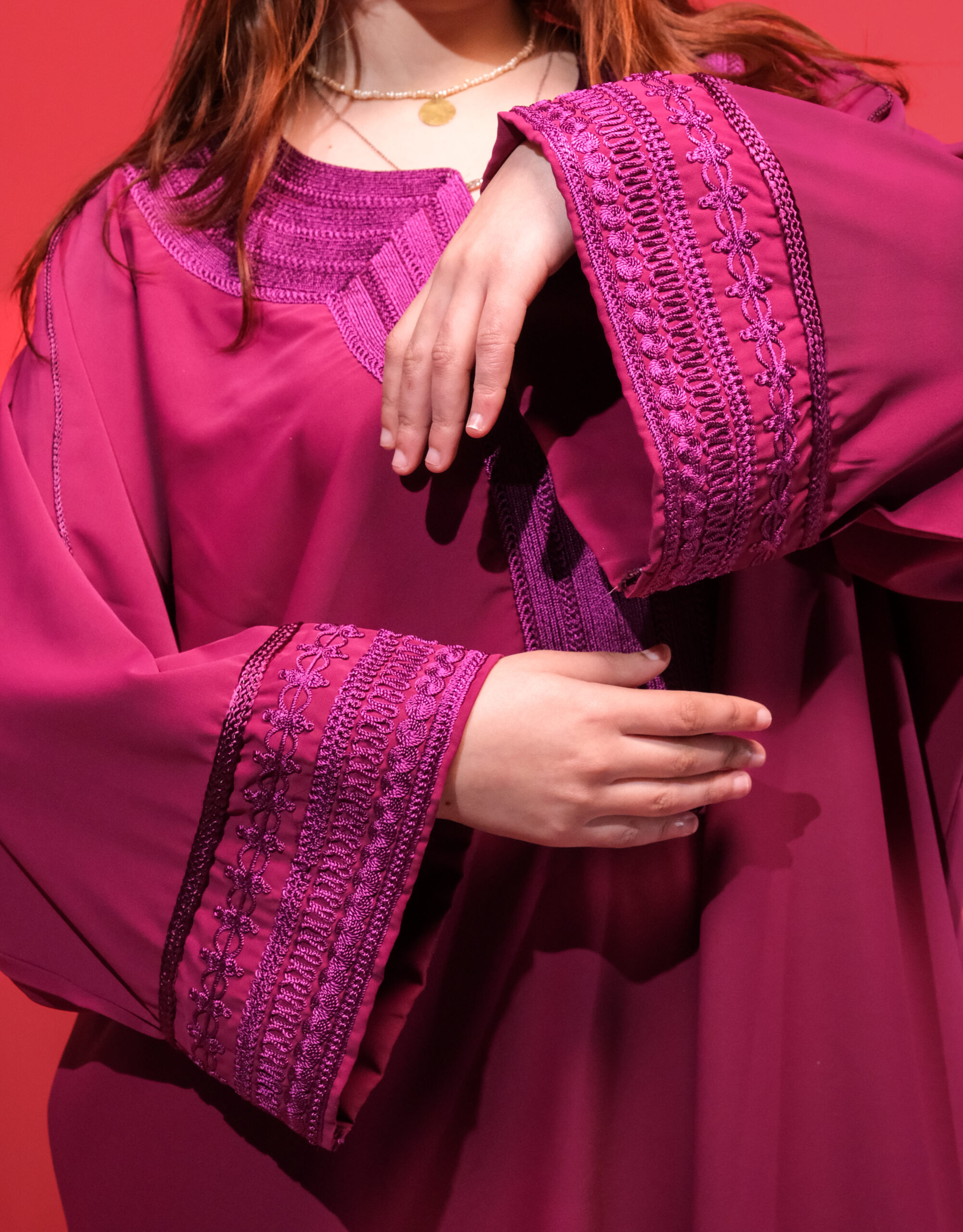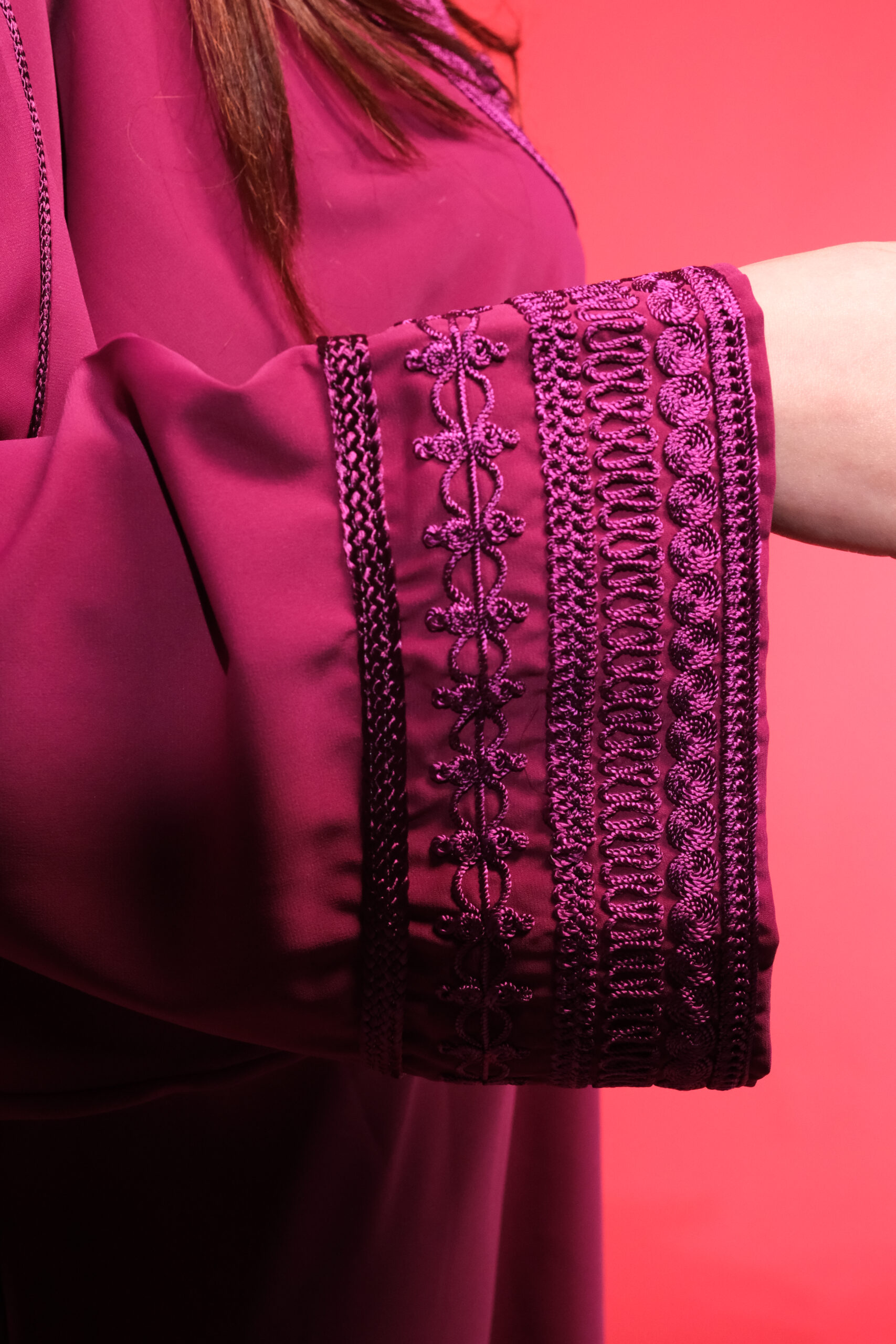 التطريز: خياطة “المعلم” بدقة عالية على الصدر والأكمام.